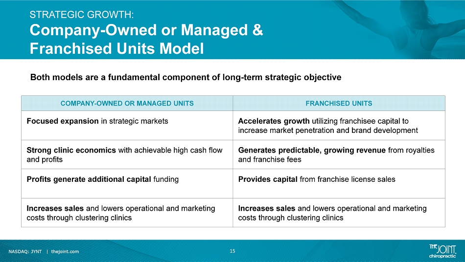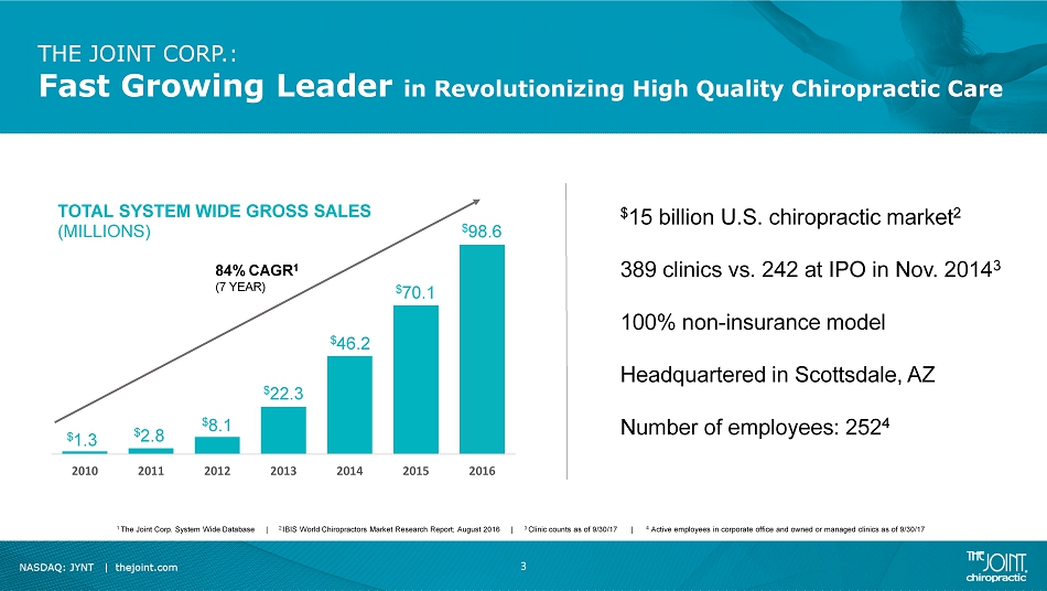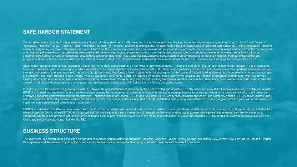 SAFE HARBOR STATEMENT Certain statements contained in this presentation are "forward - looking statements." We have tried to identify these forward - look ing statements by using words such as "may," "might," " will," "expect,” "anticipate,'' "'believe,“ "could," " intend," "plan," "estimate," "should," "if,“ "project," and similar expressions. All st ate ments other than statements of historical facts contained in this presentation, including statements regarding our growth strategies, our vision, future operations, future financial position, future revenue, project ed costs, prospects, plans, objectives of management and expected market growth and potential are forward - looking statements. We have based these forward - looking statements on our current expectations and pro jections about future events. However, these forward - looking statements are subject to risks, uncertainties, assumptions and other factors that may cause our actual results, performance or achievements to be materially different from our expectations and projections. Some of these risks, uncertainties and other factors are set forth in this presentation and in other documents w e w ill file with the Securities and Exchange Commission (the "SEC"). Given these risks and uncertainties, readers are cautioned not to place undue reliance on our forward - looking statements. Projec tions and other forward - looking statements included in this presentation have been prepared based on assumptions, which we believe to be reasonable, but not in accordance with U.S. GAAP or any guide lin es of the SEC. Actual results may vary, perhaps materially. You are strongly cautioned not to place undue reliance on such projections and other forward - looking statements. All subsequent written and oral forward - looking statements attributable us or to persons acting on our behalf are expressly qualified in their entirety by these cautionary statements. Except as required by federal securities la ws, we disclaim any intention or obligation to update or revise any forward - looking statements, whether as a result of new information, future events or otherwise. Any such forward - looking statements, whe ther made in this presentation or elsewhere, should be considered in the context of the various disclosures made by us about our businesses including, without limitation, the risk factors discussed abo ve. In addition to results presented in accordance with U.S. GAAP, this presentation includes a presentation of EBITDA and Adjust ed EBITDA, which are non - GAAP financial measures. EBITDA and Adjusted EBITDA are presented because they are important measures used by management to assess financial performance, as management be lie ves they provide a more transparent view of the Company’s underlying operating performance and operating trends. Reconciliations of net loss to EBITDA and Adjusted EBITDA are presente d w here applicable. The Company defines EBITDA as net income (loss) before net interest, taxes, depreciation and amortization expenses. The Company defines Adjusted EBITDA as EBITDA before acqu isi tion - related expenses, bargain purchase gain, loss on disposition or impairment, and stock - based compensation expenses. EBITDA and Adjusted EBITDA do not represent and should not be considered alternatives to net income or cash flows from operat ion s, as determined by accounting principles generally accepted in the United States, or GAAP. While EBITDA and Adjusted EBITDA are frequently used as measures of financial performance and the abi lit y to meet debt service requirements, they are not necessarily comparable to other similarly titled captions of other companies due to potential inconsistencies in the methods of calculati on. EBITDA and Adjusted EBITDA should be reviewed in conjunction with the Company’s financial statements filed with the SEC. BUSINESS STRUCTURE The Joint Corp. is a franchisor of clinics and an operator of clinics in certain states. In Arkansas, California, Colorado, F lor ida, Illinois, Kansas, Minnesota, New Jersey, New York, North Carolina, Oregon, Pennsylvania, and Tennessee, The Joint Corp. and its franchisees provide management services to affiliated professional chiro pra ctic practices . 2