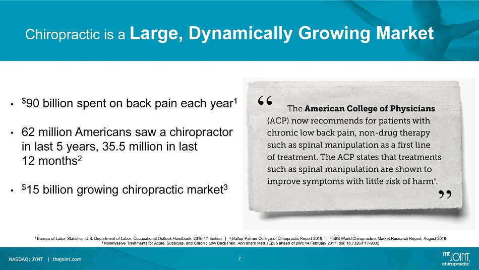 Chiropractic is a L arge, Dynamically Growing Market • $ 90 billion spent on back pain each year 1 • 62 million Americans saw a chiropractor in last 5 years, 35.5 million in last 12 months 2 • $ 15 billion growing chiropractic market 3 1 Bureau of Labor Statistics, U.S. Department of Labor, Occupational Outlook Handbook, 2016 - 17 Edition | 2 Gallup - Palmer College of Chiropractic Report 2016 | 3 IBIS World Chiropractors Market Research Report; August 2016 4 Noninvasive Treatments for Acute, Subacute, and Chronic Low Back Pain. Ann Intern Med. [Epub ahead of print 14 February 2017] doi: 10.7326/P17 - 9032 7