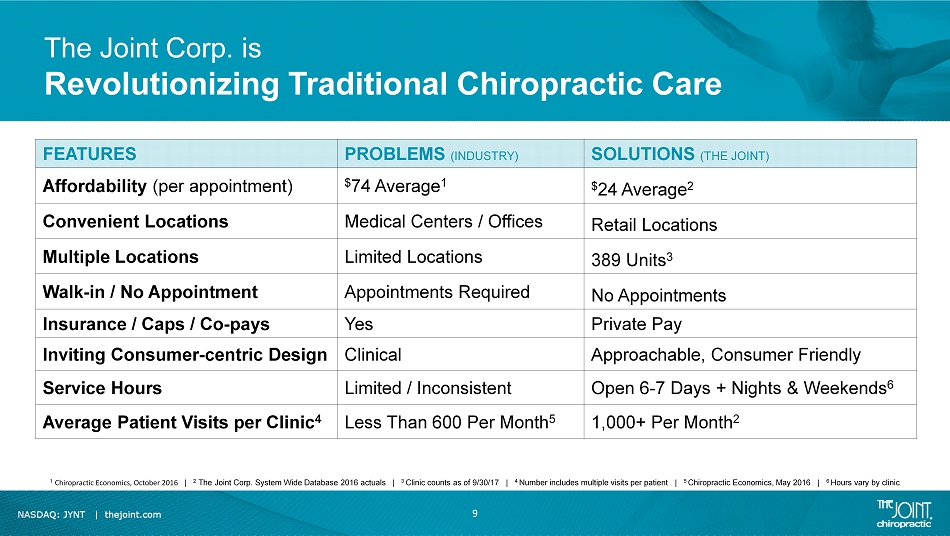 THE JOINT CORP.: Fast Growing Leader in Revolutionizing High Quality Chiropractic Care $ 15 billion U.S. chiropractic market 2 389 clinics vs. 242 at IPO in Nov. 2014 3 100 % non - insurance model Headquartered in Scottsdale, AZ Number of employees: 252 4 1 The Joint Corp. System Wide Database | 2 IBIS World Chiropractors Market Research Report; August 2016 | 3 Clinic counts as of 9 /30/17 | 4 Active employees in corporate office and owned or managed clinics as of 9 /30/17 2010 2011 2012 2013 2014 2015 2016 TOTAL SYSTEM WIDE GROSS SALES (MILLIONS) $ 1.3 $ 2.8 $ 8.1 $ 22.3 $ 46.2 $ 70.1 $ 98.6 84% CAGR 1 (7 YEAR) 3