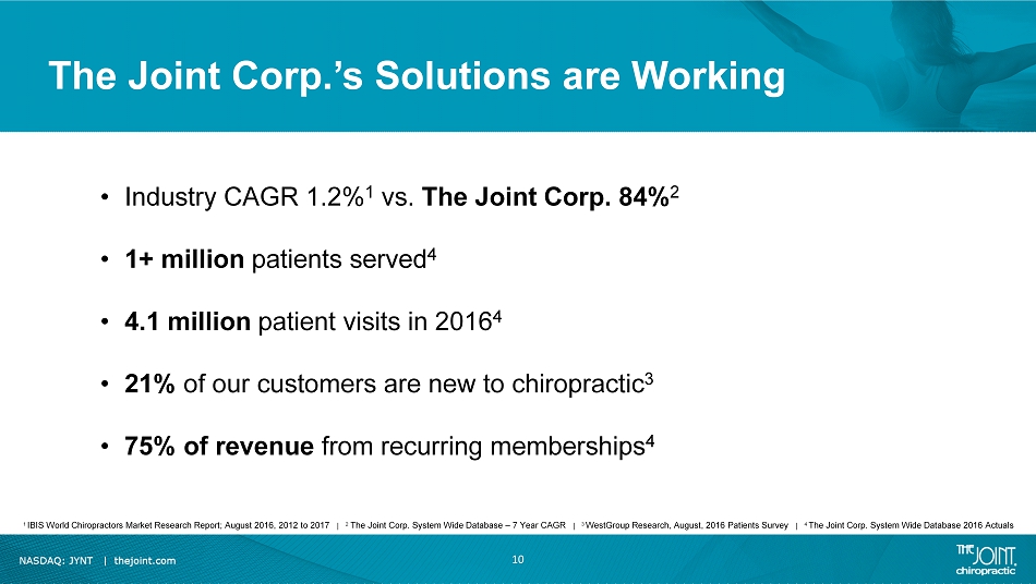 The Joint Corp. is Revolutionizing Traditional Chiropractic Care FEATURES PROBLEMS (INDUSTRY) SOLUTIONS (THE JOINT) Affordability (per appointment) $ 74 Average 1 $ 24 Average 2 Convenient Locations Medical Centers / Offices Retail Locations Multiple Locations Limited Locations 389 Units 3 Walk - in / No Appointment Appointments Required No Appointments Insurance / Caps / Co - pays Yes Private Pay Inviting Consumer - centric Design Clinical Approachable, Consumer Friendly Service Hours Limited / Inconsistent Open 6 - 7 Days + Nights & Weekends 6 Average Patient Visits per Clinic 4 Less Than 600 Per Month 5 1,000+ Per Month 2 1 Chiropractic Economics, October 2016 | 2 The Joint Corp. System Wide Database 2016 actuals | 3 Clinic counts as of 9 /30/17 | 4 Number includes multiple visits per patient | 5 Chiropractic Economics, May 2016 | 6 Hours vary by clinic 9