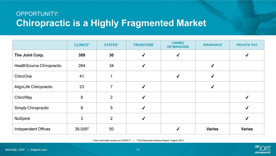 The Joint Corp.’s Solutions are Working • Industry CAGR 1.2% 1 vs. The Joint Corp. 84% 2 • 1+ million patients served 4 • 4.1 million patient visits in 2016 4 • 21% of our customers are new to chiropractic 3 • 75% of revenue from recurring memberships 4 1 IBIS World Chiropractors Market Research Report; August 2016, 2012 to 2017 | 2 The Joint Corp. System Wide Database – 7 Year CAGR | 3 WestGroup Research, August, 2016 Patients Survey | 4 The Joint Corp. System Wide Database 2016 Actuals 10