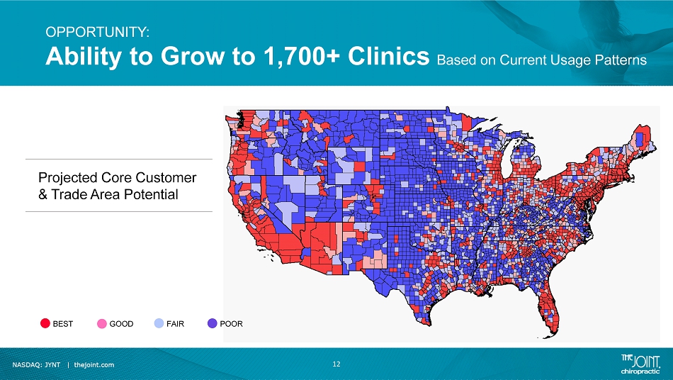 OPPORTUNITY: Chiropractic is a Highly Fragmented Market CLINICS 1 STATES 1 FRANCHISE OWNED OR MANAGED INSURANCE PRIVATE PAY The Joint Corp . 389 30 ط ط ط HealthSource Chiropractic 264 34 ط ط ChiroOne 41 1 ط ط AlignLife Chiropractic 23 7 ط ط ChiroWay 8 2 ط ط Simply Chiropractic 8 5 ط ط NuSpine 3 2 ط ط Independent Offices 39,000 2 50 ط Varies Varies 1 Clinic and state counts as of 9/30/17 | 2 First Research Industry Report; August 2015 11