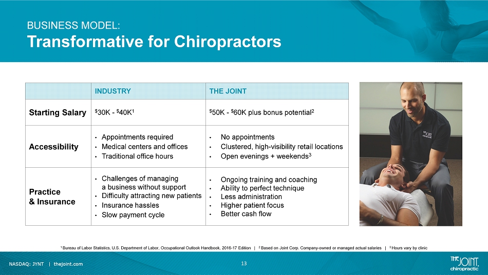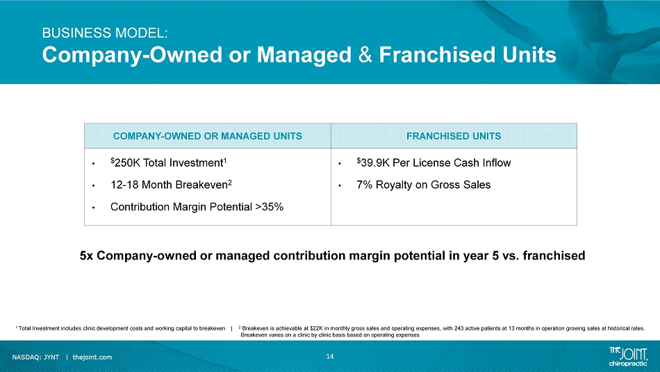 BUSINESS MODEL: Transformative for Chiropractors INDUSTRY THE JOINT Starting Salary $ 30K - $ 40K 1 $ 50K - $ 60K plus bonus potential 2 Accessibility • Appointments required • Medical centers and offices • Traditional office hours • No appointments • Clustered, h igh - visibility retail locations • Open evenings + weekends 3 Practice & Insurance • Challenges of managing a business without support • Difficulty attracting new patients • I nsurance hassles • Slow payment cycle • Ongoing training and coaching • Ability to perfect technique • Less administration • Higher patient focus • Better cash flow 1 Bureau of Labor Statistics, U.S. Department of Labor, Occupational Outlook Handbook, 2016 - 17 Edition | 2 Based on Joint Corp. Company - owned or managed actual salaries | 3 Hours vary by clinic 13