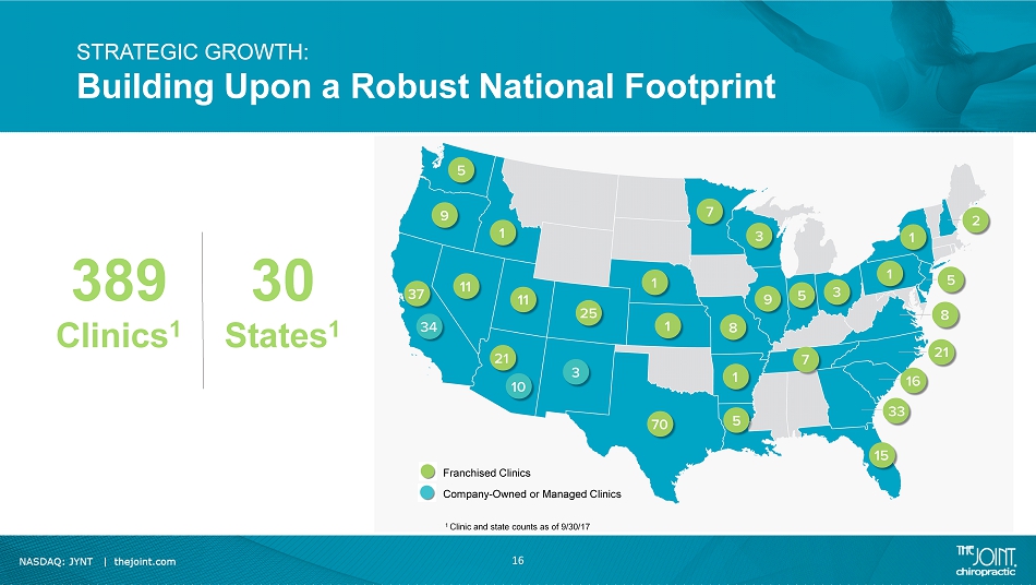 STRATEGIC GROWTH: Building Upon a Robust National Footprint 389 Clinics 1 30 States 1 Franchised Clinics Company - Owned or Managed Clinics 16 1 Clinic and state counts as of 9/30/17