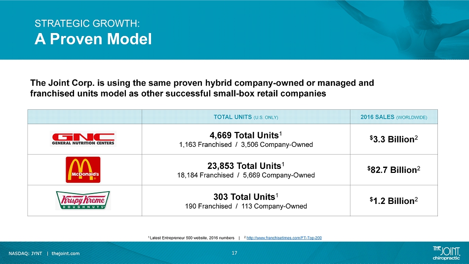 STRATEGIC GROWTH: A Proven Model TOTAL UNITS (U.S. ONLY) 2016 SALES (WORLDWIDE) 4,669 Total Units 1 1,163 Franchised / 3,506 Company - Owned $ 3.3 Billion 2 23,853 Total Units 1 18,184 Franchised / 5,669 Company - Owned $ 82.7 Billion 2 303 Total Units 1 190 Franchised / 113 Company - Owned $ 1.2 Billion 2 1 Latest Entrepreneur 500 website, 2016 numbers | 2 http:// www.franchisetimes.com/FT - Top - 200 The Joint Corp. is using the same proven hybrid company - owned or managed and franchised units model as other successful small - box retail companies 17