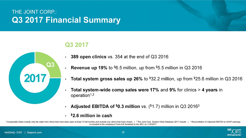 THE JOINT CORP.: Q3 2017 Financial Summary Q3 2017 • 389 open clinics vs . 354 at the end of Q3 2016 • Revenue up 19% to $ 6.5 million, up from $ 5.5 million in Q3 2016 • Total system gross sales up 26% to $ 32.2 million, up from $ 25.6 million in Q3 2016 • Total s ystem - wide comp sales were 17% and 9 % for clinics > 4 years in operation 1,2 • Adjusted EBITDA of $ 0.3 million vs. ( $ 1.7) million in Q3 2016 3 • $ 2.6 million in cash 2017 Q3 18 1 Comparable Sales include only the sales from clinics that have been open at least 13 full months and exclude any clinics that ha ve closed | 2 The Joint Corp. System Wide Database 2017 Actuals | 3 Reconciliation of Adjusted EBITDA to GAAP earnings is included in the company’s Form 8 - K furnished to the SEC on 11/9/2017