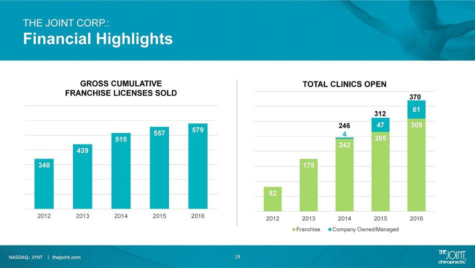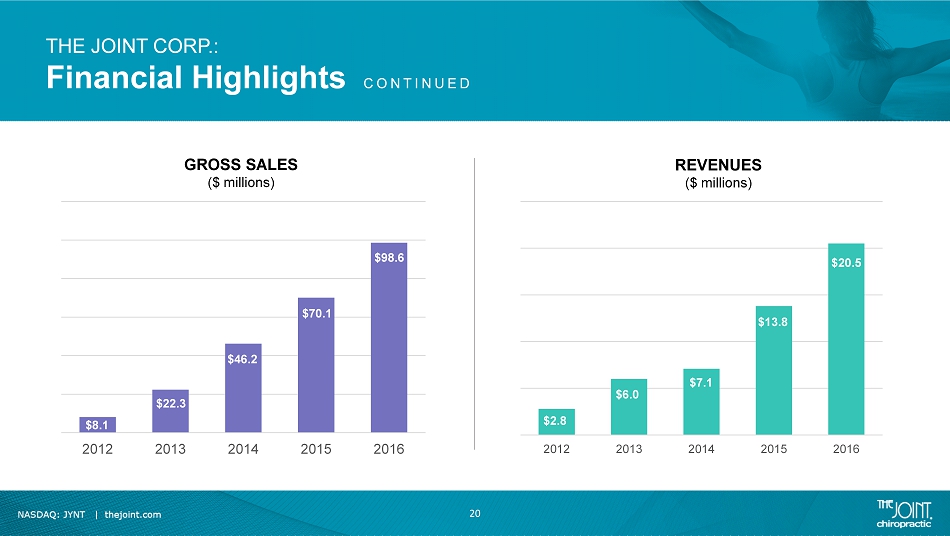 THE JOINT CORP.: Financial Highlights GROSS CUMULATIVE FRANCHISE LICENSES SOLD TOTAL CLINICS OPEN 340 439 515 557 579 2012 2013 2014 2015 2016 82 175 242 265 309 4 47 61 2012 2013 2014 2015 2016 Franchise Company Owned/Managed 246 312 370 19