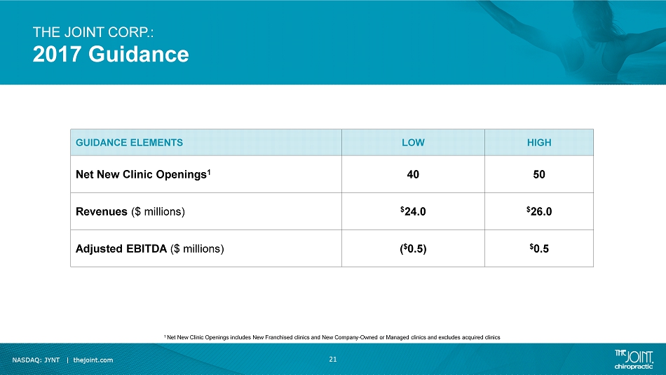 $2.8 $6.0 $7.1 $13.8 $20.5 2012 2013 2014 2015 2016 REVENUES ($ millions) THE JOINT CORP.: Financial Highlights CONTINUED GROSS SALES ($ millions) $8.1 $22.3 $46.2 $70.1 $98.6 2012 2013 2014 2015 2016 20
