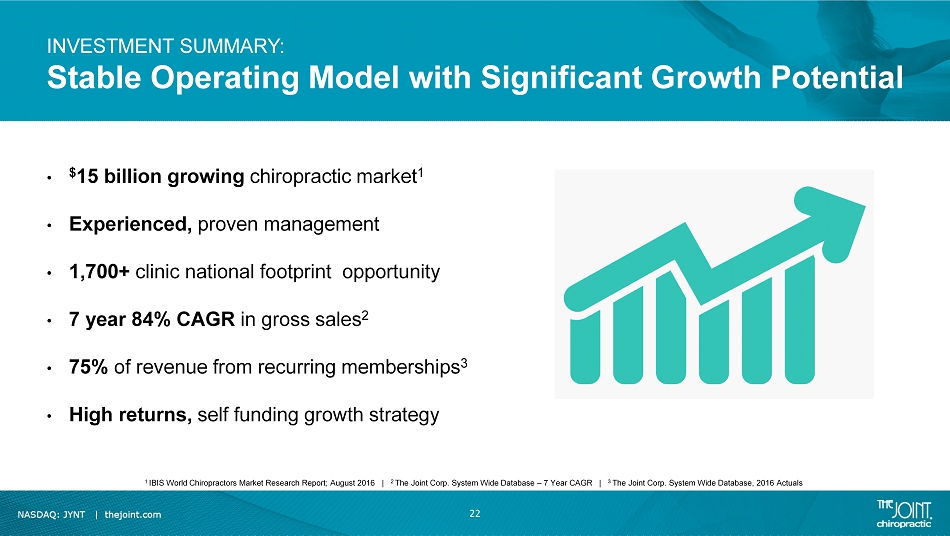 GUIDANCE ELEMENTS LOW HIGH Net New Clinic Openings 1 40 50 Revenues ($ millions ) $ 24.0 $ 26.0 Adjusted EBITDA ($ millions ) ( $ 0 .5 ) $ 0.5 THE JOINT CORP.: 2017 Guidance 1 Net New Clinic Openings includes New Franchised clinics and New Company - Owned or Managed clinics and excludes acquired clinics 21