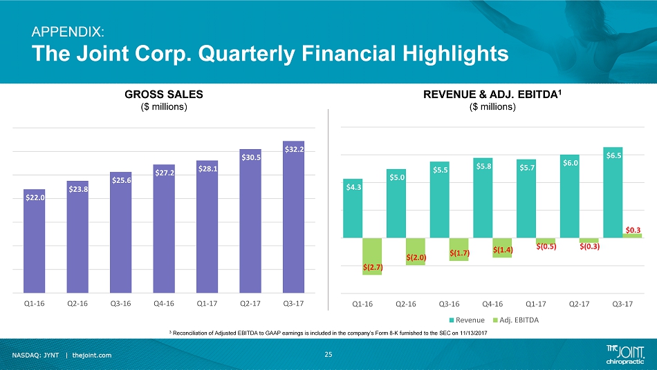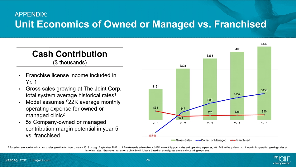 APPENDIX: Unit Economics of Owned or Managed vs. Franchised Cash Contribution ($ thousands) 24 • Franchise l icense income included in Yr. 1 • Gross sales growing at The Joint Corp. total system average historical rates 1 • Model assumes $ 22K average monthly operating expense for owned or managed clinic 2 • 5x Company - owned or managed contribution margin potential in year 5 vs. franchised 1 Based on average historical gross sales growth rates from January 2013 through September 2017 | 2 Breakeven is achievable at $22K in monthly gross sales and operating expenses, with 243 active patients at 13 months in opera ti on growing sales at historical rates. Breakeven varies on a clinic by clinic basis based on actual gross sales and operating expenses.