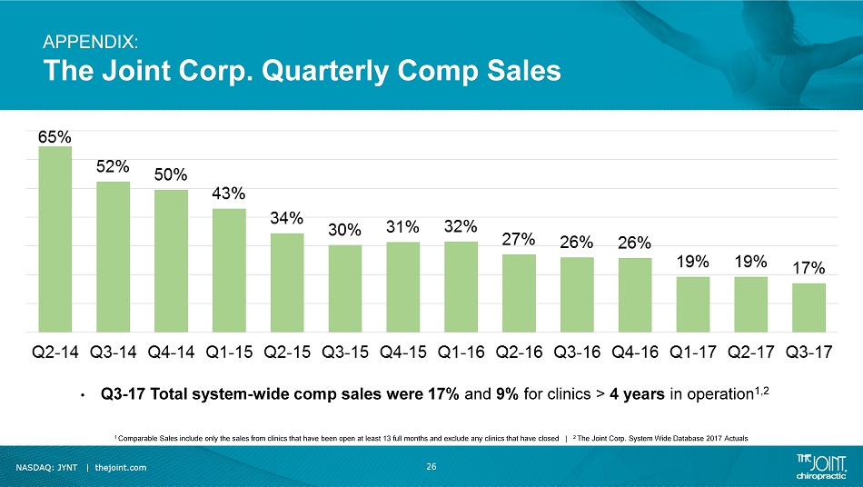 APPENDIX: The Joint Corp. Quarterly Financial Highlights 25 GROSS SALES ($ millions) $4.3 $5.0 $5.5 $5.8 $5.7 $6.0 $6.5 $(2.7) $(2.0) $(1.7) $(1.4) $(0.5) $(0.3) $0.3 Q1-16 Q2-16 Q3-16 Q4-16 Q1-17 Q2-17 Q3-17 Revenue Adj. EBITDA REVENUE & ADJ. EBITDA 1 ($ millions) $22.0 $23.8 $25.6 $27.2 $28.1 $30.5 $32.2 Q1-16 Q2-16 Q3-16 Q4-16 Q1-17 Q2-17 Q3-17 3 Reconciliation of Adjusted EBITDA to GAAP earnings is included in the company’s Form 8 - K furnished to the SEC on 11/13/2017