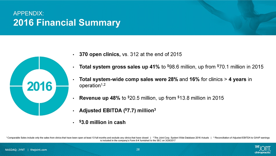 APPENDIX: 2016 Financial Summary 1 Comparable Sales include only the sales from clinics that have been open at least 13 full months and exclude any clinics that ha ve closed | 2 The Joint Corp. System Wide Database 2016 Actuals | 3 Reconciliation of Adjusted EBITDA to GAAP earnings is included in the company’s Form 8 - K furnished to the SEC on 3/28/2017 • 370 open clinics, vs. 312 at the end of 2015 • Total system gross sales up 41% to $ 98.6 million, up from $ 70.1 million in 2015 • Total system - wide comp sales were 28% and 16% for clinics > 4 years in operation 1,2 • Revenue up 48% to $ 20.5 million, up from $ 13.8 million in 2015 • Adjusted EBITDA ( $ 7.7) million 3 • $ 3.0 million in cash 2016 28