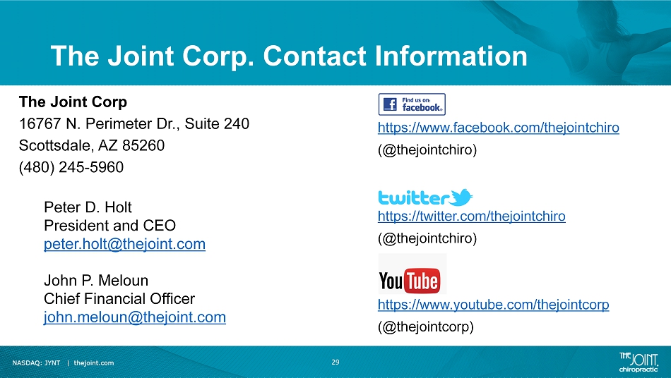 The Joint Corp. Contact Information The Joint Corp 16767 N. Perimeter Dr., Suite 240 Scottsdale, AZ 85260 (480) 245 - 5960 Peter D. Holt President and CEO peter.holt@thejoint.com John P. Meloun Chief Financial Officer john.meloun@thejoint.com 29 https :// www.facebook.com/thejointchiro (@ thejointchiro) https :// twitter.com/thejointchiro (@ thejointchiro) https :// www.youtube.com/thejointcorp (@ thejointcorp)