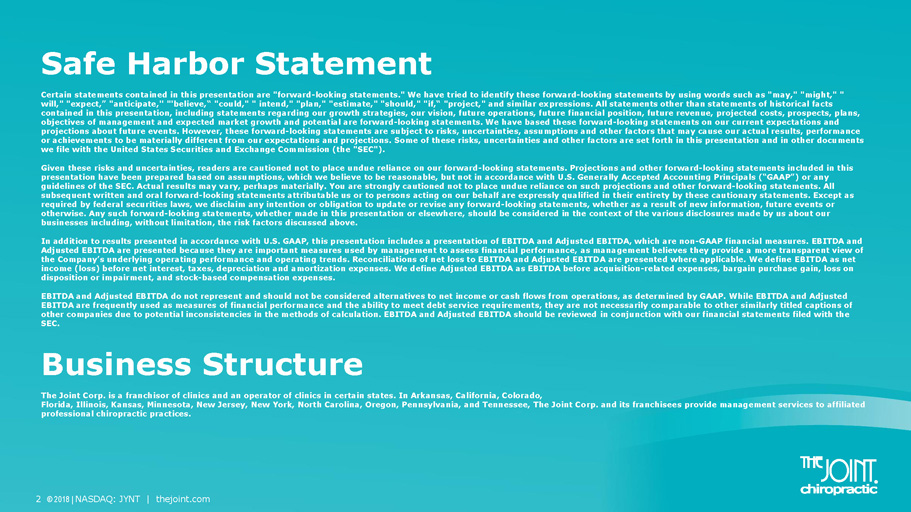 Safe Harbor Statement Certain statements contained in this presentation are "forward - looking statements." We have tried to identify these forward - look ing statements by using words such as "may," "might," " will," "expect,” "anticipate,'' "'believe,“ "could," " intend," "plan," "estimate," "should," "if,“ "project," and similar ex pre ssions. All statements other than statements of historical facts contained in this presentation, including statements regarding our growth strategies, our vision, future operations, future f ina ncial position, future revenue, projected costs, prospects, plans, objectives of management and expected market growth and potential are forward - looking statements. We have based these forward - lo oking statements on our current expectations and projections about future events. However, these forward - looking statements are subject to risks, uncertainties, assumptions and other factors that may cause our actual results, performance or achievements to be materially different from our expectations and projections. Some of these risks, uncertainties and othe r f actors are set forth in this presentation and in other documents we file with the United States Securities and Exchange Commission (the "SEC"). Given these risks and uncertainties, readers are cautioned not to place undue reliance on our forward - looking statements. Projec tions and other forward - looking statements included in this presentation have been prepared based on assumptions, which we believe to be reasonable, but not in accordance with U.S. Gene ral ly Accepted Accounting Principals (“GAAP”) or any guidelines of the SEC. Actual results may vary, perhaps materially. You are strongly cautioned not to place undue reliance on su ch projections and other forward - looking statements. All subsequent written and oral forward - looking statements attributable us or to persons acting on our behalf are expressly qualifie d in their entirety by these cautionary statements. Except as required by federal securities laws, we disclaim any intention or obligation to update or revise any forward - looking statements, whether as a result of new information, future events or otherwise. Any such forward - looking statements, whether made in this presentation or elsewhere, should be considered in the cont ext of the various disclosures made by us about our businesses including, without limitation, the risk factors discussed above. In addition to results presented in accordance with U.S. GAAP, this presentation includes a presentation of EBITDA and Adjust ed EBITDA, which are non - GAAP financial measures. EBITDA and Adjusted EBITDA are presented because they are important measures used by management to assess financial performance, as mana gem ent believes they provide a more transparent view of the Company’s underlying operating performance and operating trends. Reconciliations of net loss to EBITDA and Adjusted EBITD A a re presented where applicable. We define EBITDA as net income (loss) before net interest, taxes, depreciation and amortization expenses. We define Adjusted EBITDA as EBITDA before acq uisition - related expenses, bargain purchase gain, loss on disposition or impairment, and stock - based compensation expenses. EBITDA and Adjusted EBITDA do not represent and should not be considered alternatives to net income or cash flows from operat ion s, as determined by GAAP. While EBITDA and Adjusted EBITDA are frequently used as measures of financial performance and the ability to meet debt service requirements, they are n ot necessarily comparable to other similarly titled captions of other companies due to potential inconsistencies in the methods of calculation. EBITDA and Adjusted EBITDA should be reviewed in conjunction with our financial statements filed with the SEC. Business Structure The Joint Corp. is a franchisor of clinics and an operator of clinics in certain states. In Arkansas, California, Colorado, Florida, Illinois, Kansas, Minnesota, New Jersey, New York, North Carolina, Oregon, Pennsylvania, and Tennessee, The Joint Co rp. and its franchisees provide management services to affiliated professional chiropractic practices. 2 © 2018 | NASDAQ: JYNT | thejoint.com
