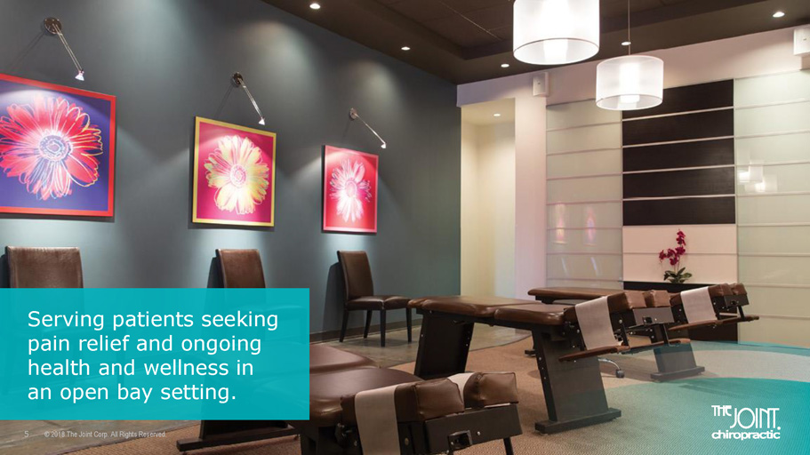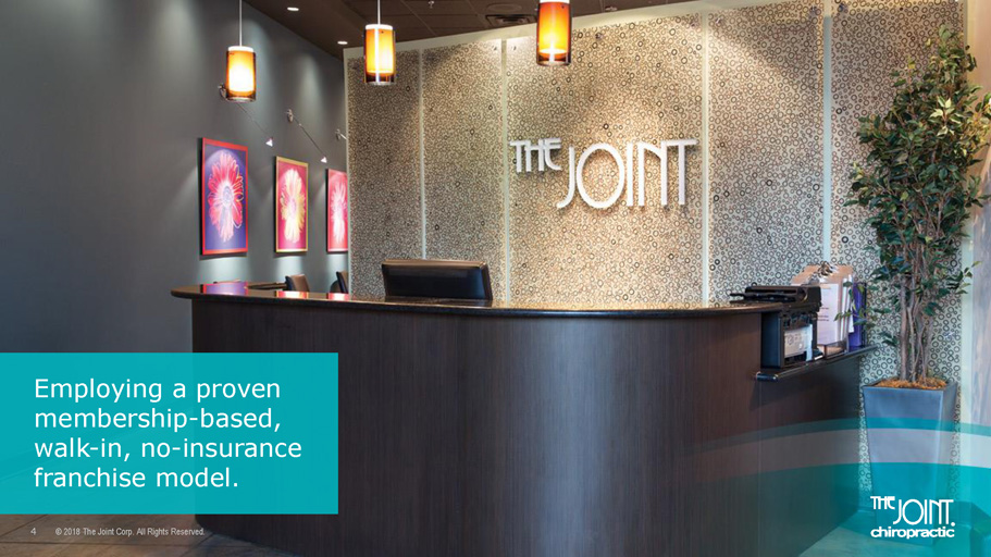 4 © 2018 | NASDAQ: JYNT | thejoint.com 4 © 2018 The Joint Corp. All Rights Reserved. Employing a proven membership - based, walk - in, no - insurance franchise model.
