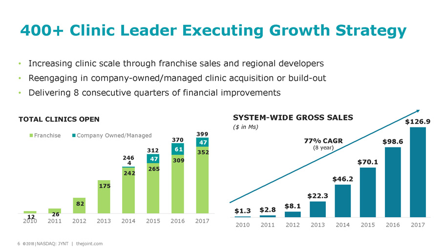 5 © 2018 | NASDAQ: JYNT | thejoint.com 5 © 2018 The Joint Corp. All Rights Reserved. Serving patients seeking pain relief and ongoing health and wellness in an open bay setting.