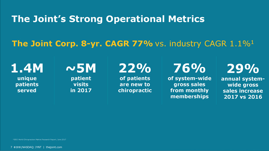 6 © 2018 | NASDAQ: JYNT | thejoint.com Achi • Increasing clinic scale through franchise sales and regional developers • Reengaging in company - owned/managed clinic acquisition or build - out • Delivering 8 consecutive quarters of financial improvements $1.3 $2.8 $8.1 $22.3 $46.2 $70.1 $98.6 $126.9 2010 2011 2012 2013 2014 2015 2016 2017 77% CAGR (8 year) SYSTEM - WIDE GROSS SALES ($ in Ms ) 400+ Clinic Leader Executing Growth Strategy 12 26 82 175 242 265 309 352 4 47 61 47 2010 2011 2012 2013 2014 2015 2016 2017 TOTAL CLINICS OPEN Franchise Company Owned/Managed 6 © 2018 | NASDAQ: JYNT | thejoint.com 312 370 246 399