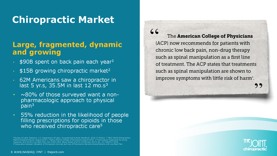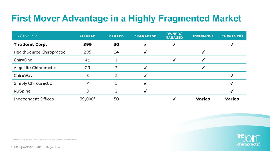 8 © 2018 | NASDAQ: JYNT | thejoint.com • $90B spent on back pain each year 1 • $15B growing chiropractic market 2 • 62M Americans saw a chiropractor in last 5 yr.s , 35.5M in last 12 mo.s 3 • ~80% of those surveyed want a non - pharmacologic approach to physical pain 3 • 55% reduction in the likelihood of people filling prescriptions for opioids in those who received chiropractic care 5 Chiropractic Market Large, fragmented, dynamic and growing 1 Bureau of Labor Statistics, U.S. Department of Labor, Occupational Outlook Handbook, 2016 - 17 Edition | 2 IBIS World Chiropractors Market Research Report; August 2016 | 3 Gallup - Palmer College of Chiropractic Report 2016 | 4 Noninvasive Treatments for Acute, Subacute, and Chronic Low Back Pain. Ann Intern Med. [ Epub ahead of print 14 February 2017] doi : 10.7326/P17 - 9032 | 5 Association between Utilization of Chiropractic Services and Use of Prescription Opioids Among Patients with Low Back Pain