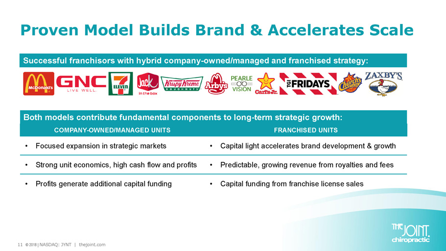 10 © 2018 | NASDAQ: JYNT | thejoint.com Revolutionizing Traditional Chiropractic Care FEATURES INDUSTRY PROBLEMS THE JOINT’S SOLUTIONS Affordability (per appointment) $ 74 Average 1 $ 26 Average Convenient Locations Medical Centers / Offices Retail Locations Multiple Locations Limited Locations 399 Units Walk - in / No Appointment Appointments Required No Appointments Insurance / Caps / Co - pays Yes Private Pay Inviting Consumer - centric Design Clinical Approachable, Consumer Friendly Service Hours Limited / Inconsistent Open 6 - 7 Days + Nights & Weekends 2 Average Patient Visits per Clinic Less Than 600 Per Month 3 1,000+ Per Month 4 1 Chiropractic Economics, October 2016 | 2 Hours vary by clinic | 3 Chiropractic Economics, May 2016 | 4 Number includes multiple visits per patient