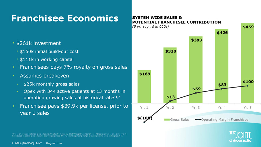 11 © 2018 | NASDAQ: JYNT | thejoint.com Successful franchisors with hybrid company - owned/managed and franchised strategy: COMPANY - OWNED/MANAGED UNITS FRANCHISED UNITS • Focused expansion in strategic markets • Capital light accelerates brand development & growth • Strong unit economics, high cash flow and profits • Predictable, growing revenue from royalties and fees • Profits generate additional capital funding • Capital funding from franchise license sales Both models contribute fundamental components to long - term strategic growth: Proven Model Builds Brand & Accelerates Scale