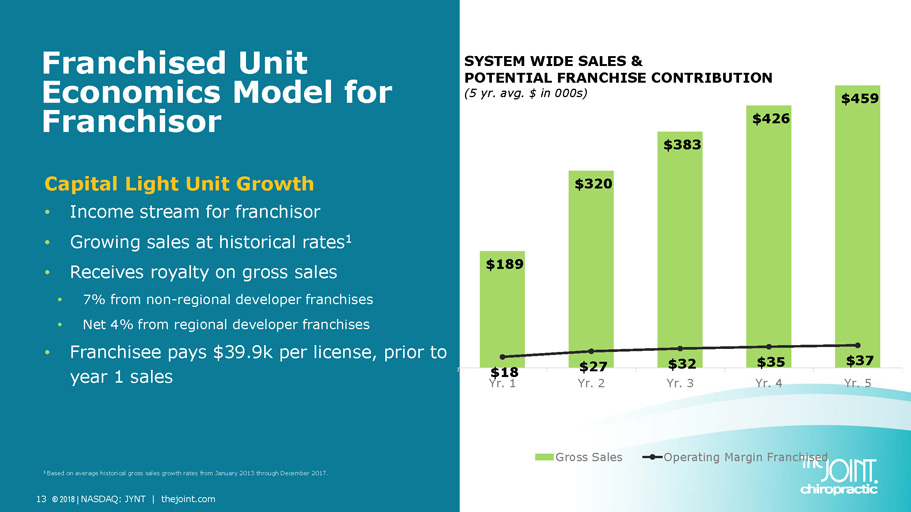 12 © 2018 | NASDAQ: JYNT | thejoint.com Franchisee Economics • $261k investment • $150k initial build - out cost • $111k in working capital • Franchisees pays 7% royalty on gross sales • Assumes breakeven • $25k monthly gross sales • Opex with 344 active patients at 13 months in operation growing sales at historical rates 1,2 • Franchisee pays $39.9k per license, prior to year 1 sales $189 $320 $383 $426 $459 $(108) $13 $59 $83 $100 Yr. 1 Yr. 2 Yr. 3 Yr. 4 Yr. 5 SYSTEM WIDE SALES & POTENTIAL FRANCHISEE CONTRIBUTION (5 yr. avg., $ in 000s) Gross Sales Operating Margin Franchisee 1 Based on average historical gross sales growth rates from January 2013 through December 2017. | 2 Breakeven varies on a clinic by clinic basis based on actual gross sales and operating expenses. This represents operating margin excluding income taxes and depreci ati on.