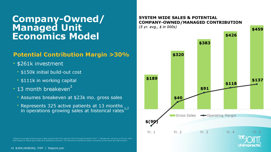 13 © 2018 | NASDAQ: JYNT | thejoint.com Franchised Unit Economics Model for Franchisor Capital Light Unit Growth • Income stream for franchisor • Growing sales at historical rates 1 • Receives royalty on gross sales • 7% from non - regional developer franchises • Net 4% from regional developer franchises • Franchisee pays $39.9k per license, prior to year 1 sales $189 $320 $383 $426 $459 $18 $27 $32 $35 $37 Yr. 1 Yr. 2 Yr. 3 Yr. 4 Yr. 5 SYSTEM WIDE SALES & POTENTIAL FRANCHISE CONTRIBUTION (5 yr. avg. $ in 000s) Gross Sales Operating Margin Franchised 1 Based on average historical gross sales growth rates from January 2013 through December 2017.