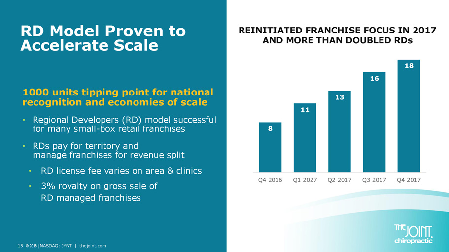 14 © 2018 | NASDAQ: JYNT | thejoint.com Company - Owned/ Managed Unit Economics Model Potential Contribution Margin >30% • $261k investment • $150k initial build - out cost • $111k in working capital • 13 month b reakeven 2 • Assumes breakeven at $23k mo. gross sales • Represents 325 active patients at 13 months in operations growing sales at historical rates 1,2 1 Based on average historical gross sales growth rates from January 2013 through December 2017. | 2 Breakeven varies on a clinic by clinic basis based on actual gross sales and operating expenses. This represents operating margin excluding income taxes and depreci ati on. $189 $320 $383 $426 $459 $(90) $40 $91 $118 $137 Yr. 1 Yr. 2 Yr. 3 Yr. 4 Yr. 5 SYSTEM WIDE SALES & POTENTIAL COMPANY - OWNED/MANAGED CONTRIBUTION (5 yr. avg., $ in 000s) Gross Sales Operating Margin