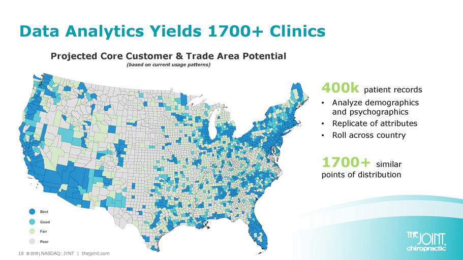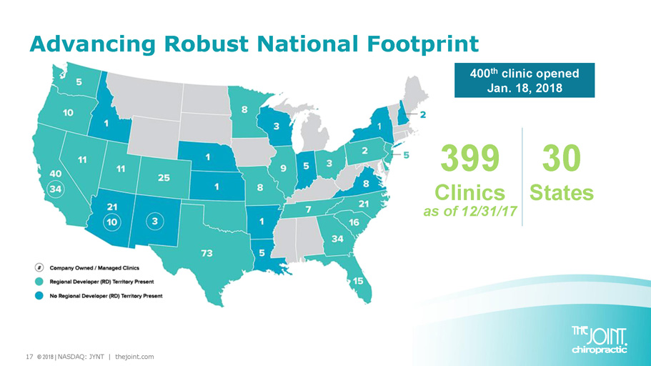 17 © 2018 | NASDAQ: JYNT | thejoint.com 399 Clinics as of 12/31/17 30 States Advancing Robust National Footprint 400 th clinic opened Jan. 18, 2018
