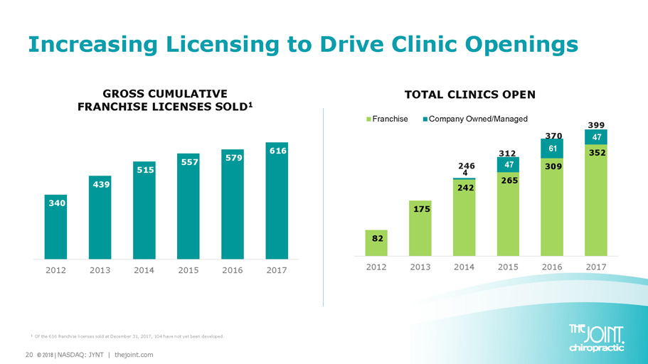 19 © 2018 | NASDAQ: JYNT | thejoint.com Achi $ in Ms 2017 IMPROVEMENT 2017 vs. 2016 Revenue $25.2 23% Gross profit $21.9 24% G&A $18.5 (28)% Net loss $(3.3) Up $11.9 Adjusted EBITDA 2 $(0.1) Up $7.6, 99% Cash and equivalents at Dec. 31, 2017 $4.2 Up $1.2 Full Year 2017 Metrics 19 © 2018 | NASDAQ: JYNT | thejoint.com • System - wide gross sales up 29% to $126.9M,from $98.6M in 2016 • System - wide comp sales 1 for clinics >13 months in operation increased 21%, compared to 28% in 2016 • System - wide comp sales 1 for clinics >48 months in operation increased 13%, compared to 16% in 2016 1 Comparable Sales include only the sales from clinics that have been open at least 13 or 48 full months and exclude any clinic s t hat have closed. 2 Reconciliation of Adjusted EBITDA to GAAP earnings is included in the Appendix.