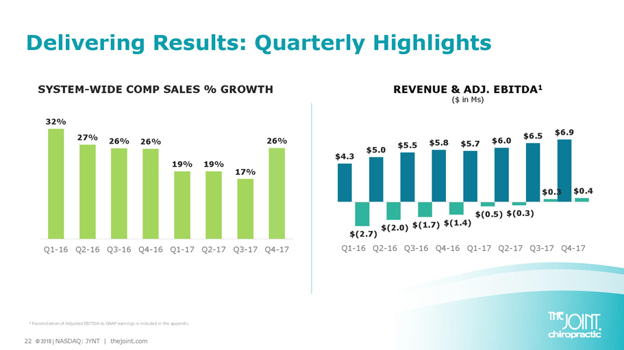 21 © 2018 | NASDAQ: JYNT | thejoint.com Driving Top - line Growth SYSTEM - WIDE GROSS SALES ($ in Ms ) $8.1 $22.3 $46.2 $70.1 $98.6 $126.9 2012 2013 2014 2015 2016 2017 $2.8 $6.0 $7.1 $13.8 $20.5 $25.2 2012 2013 2014 2015 2016 2017 REVENUE ($ in Ms )