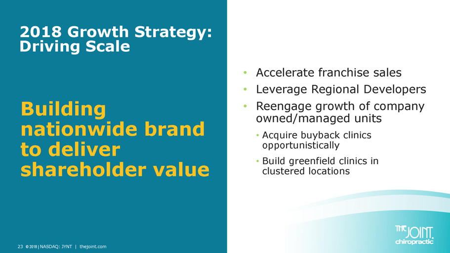 22 © 2018 | NASDAQ: JYNT | thejoint.com Delivering Results: Quarterly Highlights SYSTEM - WIDE COMP SALES % GROWTH REVENUE & ADJ. EBITDA 1 ($ in Ms ) 1 Reconciliation of Adjusted EBITDA to GAAP earnings is included in the appendix. $4.3 $5.0 $5.5 $5.8 $5.7 $6.0 $6.5 $6.9 $(2.7) $(2.0) $(1.7) $(1.4) $(0.5) $(0.3) $0.3 $0.4 Q1-16 Q2-16 Q3-16 Q4-16 Q1-17 Q2-17 Q3-17 Q4-17 32% 27% 26% 26% 19% 19% 17% 26% Q1-16 Q2-16 Q3-16 Q4-16 Q1-17 Q2-17 Q3-17 Q4-17