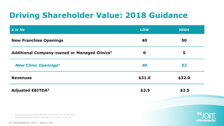 23 © 2018 | NASDAQ: JYNT | thejoint.com 2018 Growth Strategy: Driving Scale • Accelerate franchise sales • Leverage Regional Developers • Reengage growth of company owned/managed units • Acquire buyback clinics opportunistically • Build greenfield clinics in clustered locations Building nationwide brand to deliver shareholder value
