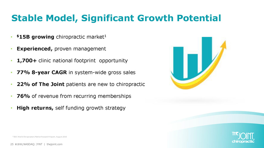 24 © 2018 | NASDAQ: JYNT | thejoint.com $ in Ms LOW HIGH New Franchise Openings 40 50 Additional Company - owned or Managed Clinics 1 0 5 New Clinic Openings 1 40 52 Revenues $31.0 $32.0 Adjusted EBITDA 2 $2.5 $3.5 Driving Shareholder Value: 2018 Guidance 1 Existing clinics are acquired from franchisees and are neutral to the total clinic count. 2 Reconciliation of Adjusted EBITDA to GAAP earnings is included in the appendix.