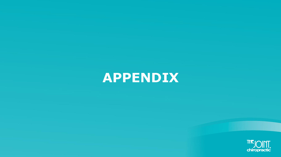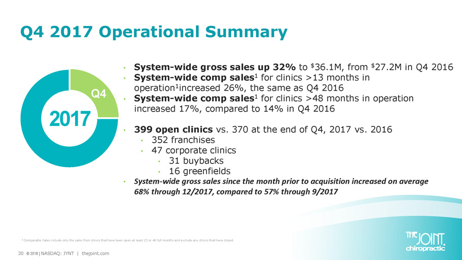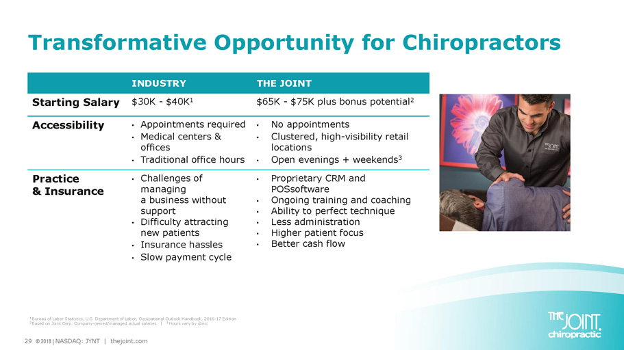 29 © 2018 | NASDAQ: JYNT | thejoint.com INDUSTRY THE JOINT Starting Salary $30K - $40K 1 $65K - $75K plus bonus potential 2 Accessibility • Appointments required • Medical centers & offices • Traditional office hours • No appointments • Clustered, h igh - visibility retail locations • Open evenings + weekends 3 Practice & Insurance • Challenges of managing a business without support • Difficulty attracting new patients • I nsurance hassles • Slow payment cycle • Proprietary CRM and POSsoftware • Ongoing training and coaching • Ability to perfect technique • Less administration • Higher patient focus • Better cash flow 1 Bureau of Labor Statistics, U.S. Department of Labor, Occupational Outlook Handbook, 2016 - 17 Edition 2 Based on Joint Corp. Company - owned/managed actual salaries | 3 Hours vary by clinic Transformative Opportunity for Chiropractors