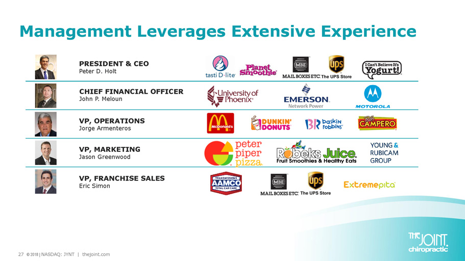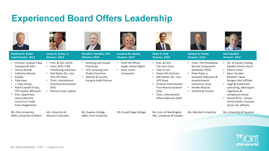 27 © 2018 | NASDAQ: JYNT | thejoint.com PRESIDENT & CEO Peter D. Holt CHIEF FINANCIAL OFFICER John P. Meloun VP, OPERATIONS Jorge Armenteros VP, MARKETING Jason Greenwood VP, FRANCHISE SALES Eric Simon Management Leverages Extensive Experience
