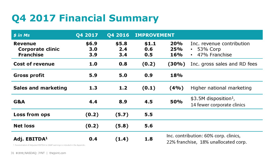 30 © 2018 | NASDAQ: JYNT | thejoint.com Q4 2017 Operational Summary • System - wide gross sales up 32% to $ 36.1M, from $ 27.2M in Q4 2016 • System - wide comp sales 1 for clinics >13 months in operation 1 increased 26%, the same as Q4 2016 • System - wide comp sales 1 for clinics >48 months in operation increased 17%, compared to 14% in Q4 2016 • 399 open clinics vs. 370 at the end of Q4, 2017 vs. 2016 • 352 franchises • 47 corporate clinics • 31 buybacks • 16 greenfields • System - wide gross sales since the month prior to acquisition increased on average 68% through 12/2017, compared to 57% through 9/2017 2017 Q4 1 Comparable Sales include only the sales from clinics that have been open at least 13 or 48 full months and exclude any clinic s t hat have closed.