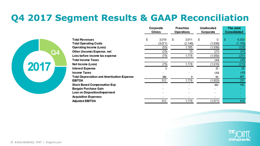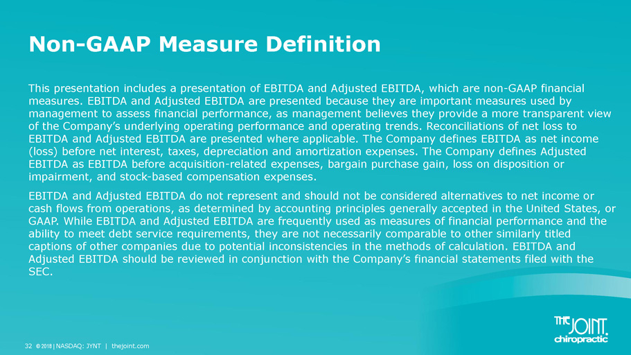 Non - GAAP Measure Definition This presentation includes a presentation of EBITDA and Adjusted EBITDA, which are non - GAAP financial measures. EBITDA and Adjusted EBITDA are presented because they are important measures used by management to assess financial performance, as management believes they provide a more transparent view of the Company’s underlying operating performance and operating trends. Reconciliations of net loss to EBITDA and Adjusted EBITDA are presented where applicable. The Company defines EBITDA as net income (loss) before net interest, taxes, depreciation and amortization expenses. The Company defines Adjusted EBITDA as EBITDA before acquisition - related expenses, bargain purchase gain, loss on disposition or impairment, and stock - based compensation expenses. EBITDA and Adjusted EBITDA do not represent and should not be considered alternatives to net income or cash flows from operations, as determined by accounting principles generally accepted in the United States, or GAAP. While EBITDA and Adjusted EBITDA are frequently used as measures of financial performance and the ability to meet debt service requirements, they are not necessarily comparable to other similarly titled captions of other companies due to potential inconsistencies in the methods of calculation. EBITDA and Adjusted EBITDA should be reviewed in conjunction with the Company’s financial statements filed with the SEC. 32 © 2018 | NASDAQ: JYNT | thejoint.com