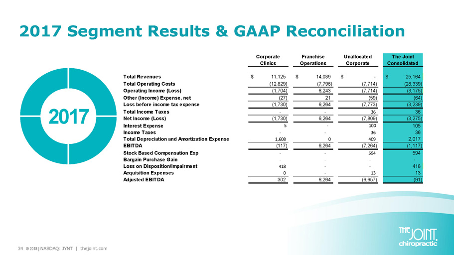 33 © 2018 | NASDAQ: JYNT | thejoint.com Q4 2017 Segment Results & GAAP Reconciliation 2017 Q4 Corporate Clinics Franchise Operations Unallocated Corporate The Joint Consolidated Total Revenues 3,019$ 3,911$ 0$ 6,929$ Total Operating Costs (3,071) (2,146) (1,938) (7,155) Operating Income (Loss) (53) 1,765 (1,938) (226) Other (Income) Expense, net (23) 13 (21) (31) Loss before income tax expense (75) 1,778 (1,959) (257) Total Income Taxes - - (43) (43) Net Income (Loss) (75) 1,778 (1,916) (213) Interest Expense 1 - 25 26 Income Taxes - - (43) (43) Total Depreciation and Amortization Expense 386 0 81 467 EBITDA 312 1,778 (1,853) 237 Stock Based Compensation Exp - - 182 182 Bargain Purchase Gain - - - - Loss on Disposition/Impairment - - - - Acquisition Expenses - - - - Adjusted EBITDA 312 1,778 (1,671) 419