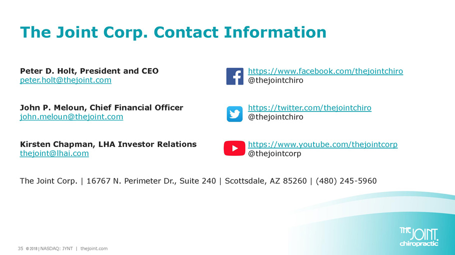 35 © 2018 | NASDAQ: JYNT | thejoint.com Peter D. Holt, President and CEO peter.holt@thejoint.com John P. Meloun, Chief Financial Officer john.meloun@thejoint.com Kirsten Chapman, LHA Investor Relations thejoint@lhai.com The Joint Corp. | 16767 N. Perimeter Dr., Suite 240 | Scottsdale, AZ 85260 | (480) 245 - 5960 The Joint Corp. Contact Information https://www.facebook.com/thejointchiro @ thejointchiro https://twitter.com/thejointchiro @ thejointchiro https://www.youtube.com/thejointcorp @ thejointcorp