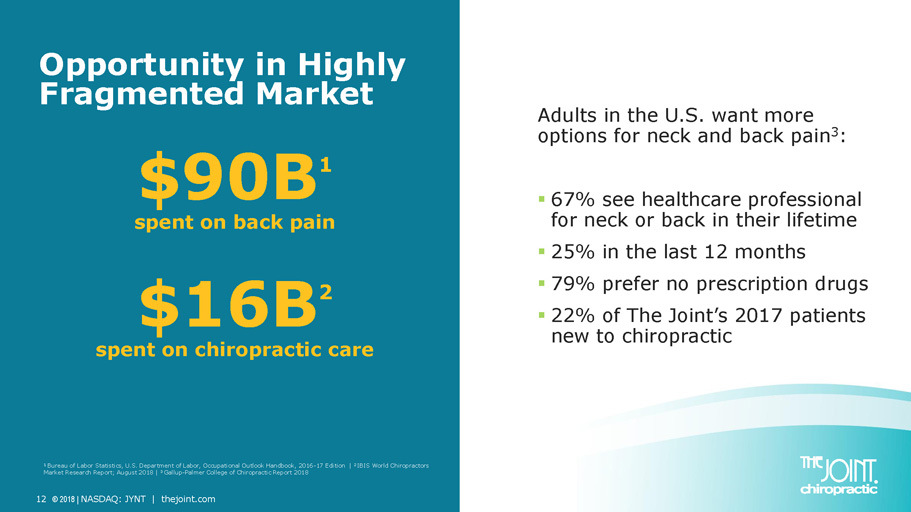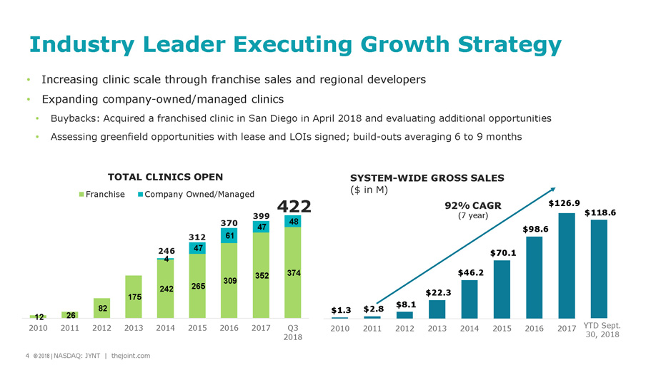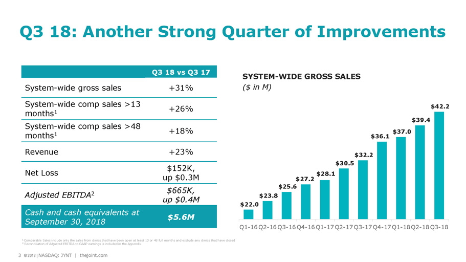 Safe Harbor Statement Certain statements contained in this presentation are "forward - looking statements." We have tried to identify these forward - look ing statements by using words such as "may," "might," " will," "expect,” "anticipate,'' "'believe,“ "could," " intend," "plan," "estimate," "should," "if,“ "project," and similar expressio ns. All statements other than statements of historical facts contained in this presentation, including statements regarding our growth strategies, our vision, future operations, future financial posi tio n, future revenue, projected costs, prospects, plans, objectives of management and expected market growth and potential are forward - looking statements. We have based these forward - looking statemen ts on our current expectations and projections about future events. However, these forward - looking statements are subject to risks, uncertainties, assumptions and other factors that may cause our actual results, performance or achievements to be materially different from our expectations and projections. Some of these risks, uncertainties and other factors are set f ort h in this presentation and in other documents we file with the United States Securities and Exchange Commission (the "SEC"). Given these risks and uncertainties, readers are cautioned not to place undue reliance on our forward - looking statements. Projec tions and other forward - looking statements included in this presentation have been prepared based on assumptions, which we believe to be reasonable, but not in accordance with U.S. Gene ral ly Accepted Accounting Principals (“GAAP”) or any guidelines of the SEC. Actual results may vary, perhaps materially. You are strongly cautioned not to place undue reliance on su ch projections and other forward - looking statements. All subsequent written and oral forward - looking statements attributable us or to persons acting on our behalf are expressly qualifie d in their entirety by these cautionary statements. Except as required by federal securities laws, we disclaim any intention or obligation to update or revise any forward - looking statements, whether as a result of new information, future events or otherwise. Any such forward - looking statements, whether made in this presentation or elsewhere, should be considered in the cont ext of the various disclosures made by us about our businesses including, without limitation, the risk factors discussed above. In addition to results presented in accordance with U.S. GAAP, this presentation includes a presentation of EBITDA and Adjust ed EBITDA, which are non - GAAP financial measures. EBITDA and Adjusted EBITDA are presented because they are important measures used by management to assess financial performance, as mana gem ent believes they provide a more transparent view of the Company’s underlying operating performance and operating trends. Reconciliations of net loss to EBITDA and Adjusted EBITD A a re presented where applicable. We define EBITDA as net income (loss) before net interest, taxes, depreciation and amortization expenses. We define Adjusted EBITDA as EBITDA before acq uisition - related expenses, bargain purchase gain, loss on disposition or impairment, and stock - based compensation expenses. EBITDA and Adjusted EBITDA do not represent and should not be considered alternatives to net income or cash flows from operat ion s, as determined by GAAP. While EBITDA and Adjusted EBITDA are frequently used as measures of financial performance and the ability to meet debt service requirements, they are n ot necessarily comparable to other similarly titled captions of other companies due to potential inconsistencies in the methods of calculation. EBITDA and Adjusted EBITDA should be reviewed in conjunction with our financial statements filed with the SEC. Business Structure The Joint Corp. is a franchisor of clinics and an operator of clinics in certain states. In Arkansas, California, Colorado, Florida, Illinois, Kansas, Minnesota, New Jersey, New York, North Carolina, Oregon, Pennsylvania, and Tennessee, The Joint Corp. and its franchisees provide management services to affiliated professional chiropractic practices. 2 © 2018 | NASDAQ: JYNT | thejoint.com