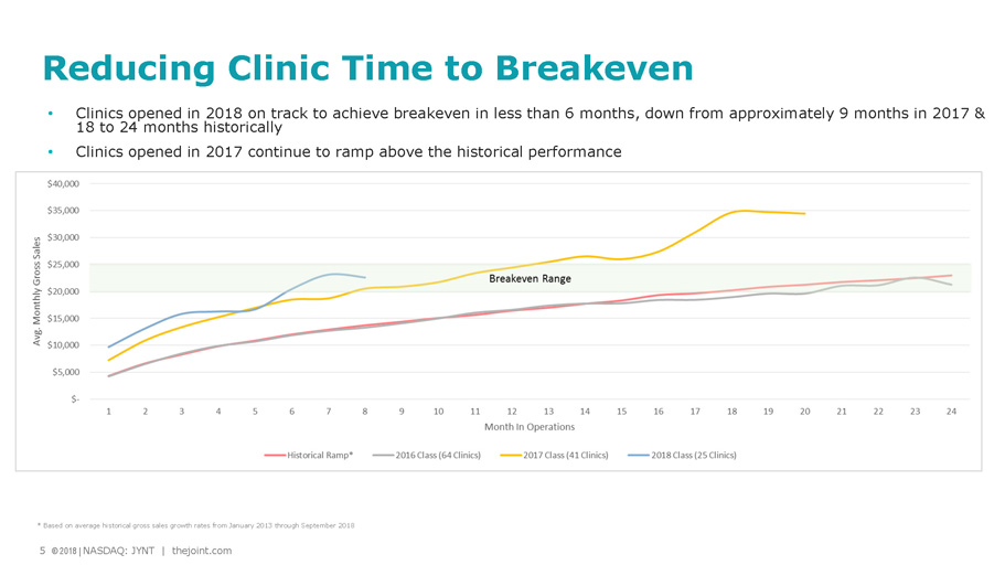 4 © 2018 | NASDAQ: JYNT | thejoint.com Achi 12 26 82 175 242 265 309 352 374 4 47 61 47 48 2010 2011 2012 2013 2014 2015 2016 2017 Q3 2018 TOTAL CLINICS OPEN Franchise Company Owned/Managed • Increasing clinic scale through franchise sales and regional developers • Expanding company - owned/managed clinics • Buybacks: Acquired a franchised clinic in San Diego in April 2018 and evaluating additional opportunities • Assessing greenfield opportunities with lease and LOIs signed; build - outs averaging 6 to 9 months $1.3 $2.8 $8.1 $22.3 $46.2 $70.1 $98.6 $126.9 $118.6 2010 2011 2012 2013 2014 2015 2016 2017 Q3 2018 SYSTEM - WIDE GROSS SALES ($ in M) 92% CAGR (7 year) Industry Leader Executing Growth Strategy 4 © 2018 | NASDAQ: JYNT | thejoint.com 312 370 422 399 246 YTD Sept. 30, 2018