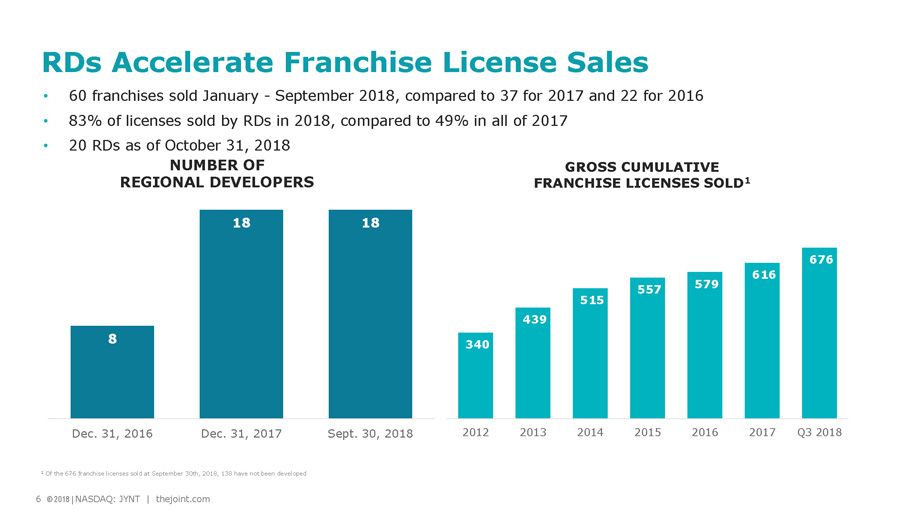 6 © 2018 | NASDAQ: JYNT | thejoint.com Franchise sales through June 2018 were 34, compared to 37 for all of 2017 • 60 franchises sold January - September 2018, compared to 37 for 2017 and 22 for 2016 • 83% of licenses sold by RDs in 2018, compared to 49% in all of 2017 • 20 RDs as of October 31, 2018 RDs Accelerate Franchise License Sales NUMBER OF REGIONAL DEVELOPERS 6 © 2018 | NASDAQ: JYNT | thejoint.com GROSS CUMULATIVE FRANCHISE LICENSES SOLD 1 1 Of the 676 franchise licenses sold at September 30th, 2018, 138 have not been developed 340 439 515 557 579 616 676 2012 2013 2014 2015 2016 2017 Q3 2018 8 18 18 Dec. 31, 2016 Dec. 31, 2017 Sept. 30, 2018