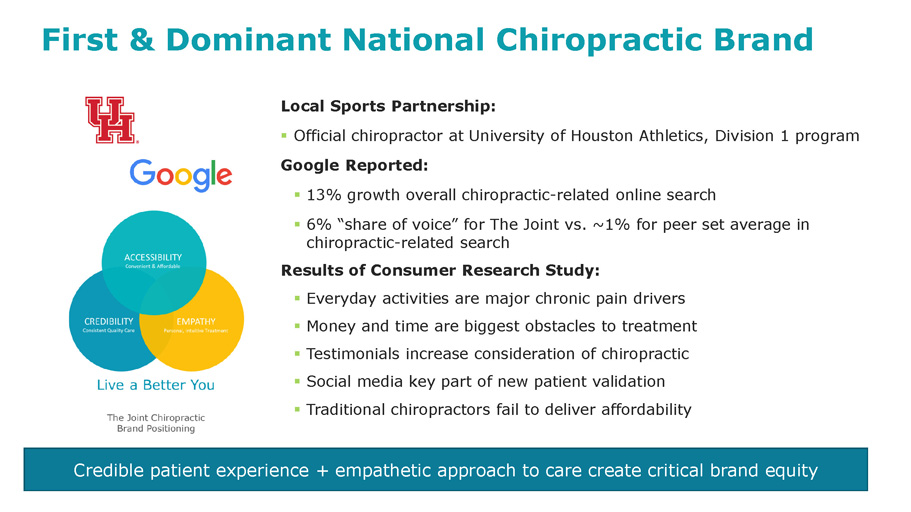 7 © 2018 | NASDAQ: JYNT | thejoint.com Achi First & Dominant National Chiropractic Brand Credible patient experience + empathetic approach to care create critical brand equity Local Sports Partnership: ▪ Official chiropractor at University of Houston Athletics, Division 1 program Google Reported: ▪ 13% growth overall chiropractic - related online search ▪ 6% “share of voice” for The Joint vs. ~1% for peer set average in chiropractic - related search Results of Consumer Research Study: ▪ Everyday activities are major chronic pain drivers ▪ Money and time are biggest obstacles to treatment ▪ Testimonials increase consideration of chiropractic ▪ Social media key part of new patient validation ▪ Traditional chiropractors fail to deliver affordability