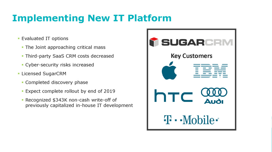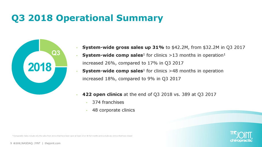 8 © 2018 | NASDAQ: JYNT | thejoint.com Achi Implementing New IT Platform ▪ Evaluated IT options ▪ The Joint approaching critical mass ▪ Third - party SaaS CRM costs decreased ▪ Cyber - security risks increased ▪ Licensed SugarCRM ▪ Completed discovery phase ▪ Expect complete rollout by end of 2019 ▪ Recognized $343K non - cash write - off of previously capitalized in - house IT development Key Customers