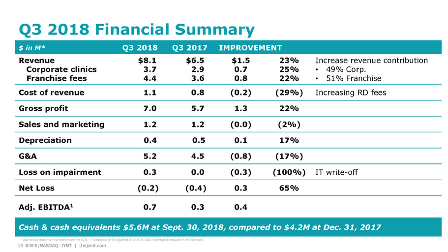9 © 2018 | NASDAQ: JYNT | thejoint.com Q3 2018 Operational Summary • System - wide gross sales up 31% to $42.2M, from $32.2M in Q3 2017 • System - wide comp sales 1 for clinics >13 months in operation 1 increased 26%, compared to 17% in Q3 2017 • System - wide comp sales 1 for clinics >48 months in operation increased 18%, compared to 9% in Q3 2017 • 422 open clinics at the end of Q3 2018 vs. 389 at Q3 2017 • 374 franchises • 48 corporate clinics 2018 Q3 1 Comparable Sales include only the sales from clinics that have been open at least 13 or 48 full months and exclude any clinic s t hat have closed