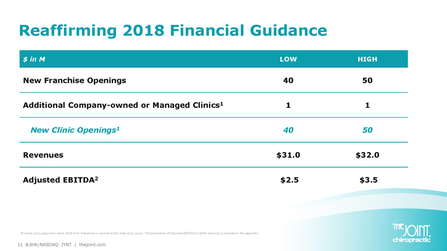 10 © 2018 | NASDAQ: JYNT | thejoint.com Achi $ in M* Q3 2018 Q3 2017 IMPROVEMENT Revenue Corporate clinics Franchise fees $8.1 3.7 4.4 $6.5 2.9 3.6 $1.5 0.7 0.8 23% 25% 22% Increase revenue contribution • 49% Corp. • 51% Franchise Cost of revenue 1.1 0.8 (0.2) (29%) Increasing RD fees Gross profit 7.0 5.7 1.3 22% Sales and marketing 1.2 1.2 (0.0) (2%) Depreciation 0.4 0.5 0.1 17% G&A 5.2 4.5 (0.8) (17%) Loss on impairment 0.3 0.0 (0.3) (100%) IT write - off Net Loss (0.2) (0.4) 0.3 65% Adj. EBITDA 1 0.7 0.3 0.4 Cash & cash equivalents $ 5.6M at Sept. 30, 2018, compared to $4.2M at Dec. 31, 2017 Q3 2018 Financial Summary 10 © 2018 | NASDAQ: JYNT | thejoint.com * Due to rounding may numbers many not sum. 1 Reconciliation of Adjusted EBITDA to GAAP earnings is included in the Appendix