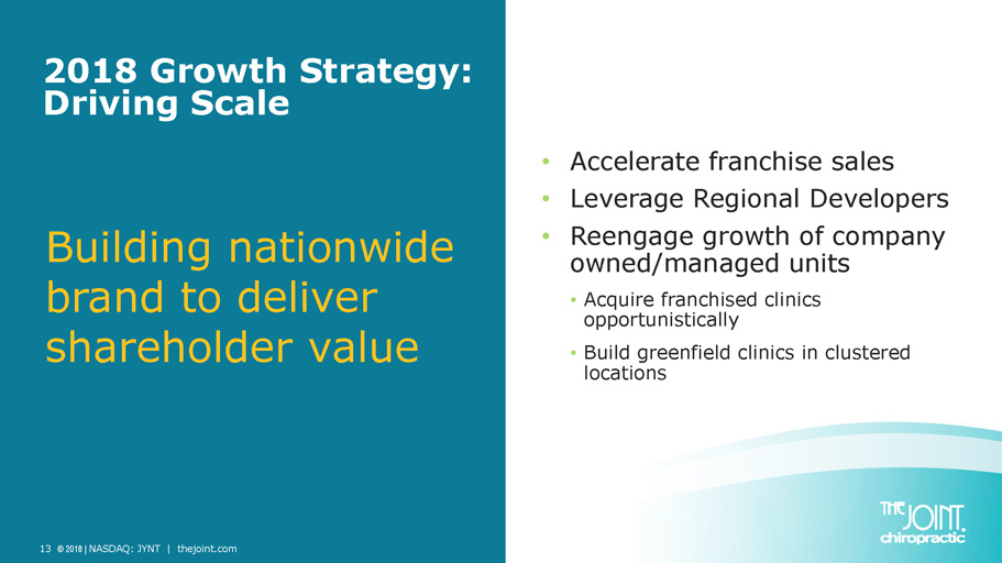 12 © 2018 | NASDAQ: JYNT | thejoint.com Opportunity in Highly Fragmented Market Adults in the U.S. want more options for neck and back pain 3 : ▪ 67% see healthcare professional for neck or back in their lifetime ▪ 25% in the last 12 months ▪ 79% prefer no prescription drugs ▪ 22% of The Joint’s 2017 patients new to chiropractic $90B 1 spent on back pain $16B 2 spent on chiropractic care 1 Bureau of Labor Statistics, U.S. Department of Labor, Occupational Outlook Handbook, 2016 - 17 Edition | 2 IBIS World Chiropractors Market Research Report; August 2018 | 3 Gallup - Palmer College of Chiropractic Report 2018