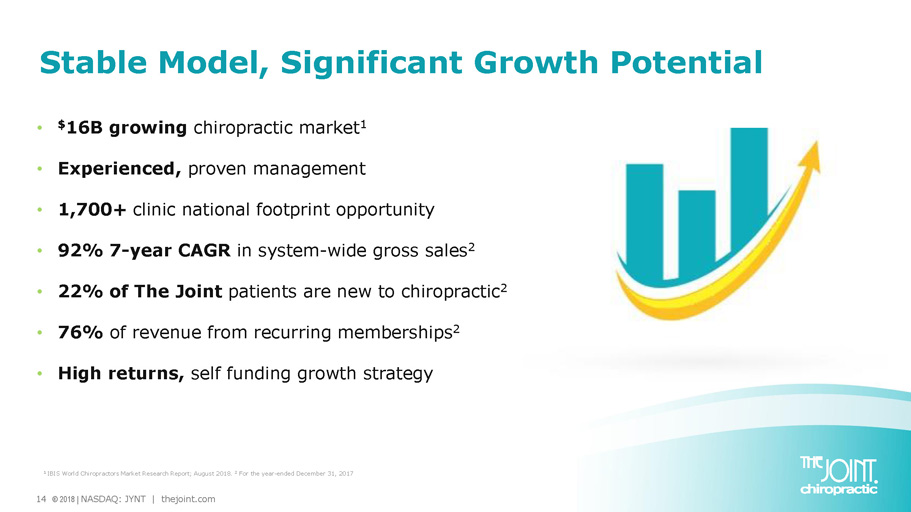 13 © 2018 | NASDAQ: JYNT | thejoint.com 2018 Growth Strategy: Driving Scale • Accelerate franchise sales • Leverage Regional Developers • Reengage growth of company owned/managed units • Acquire franchised clinics opportunistically • Build greenfield clinics in clustered locations Building nationwide brand to deliver shareholder value