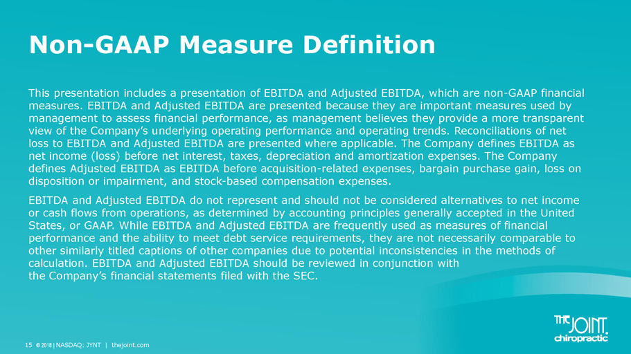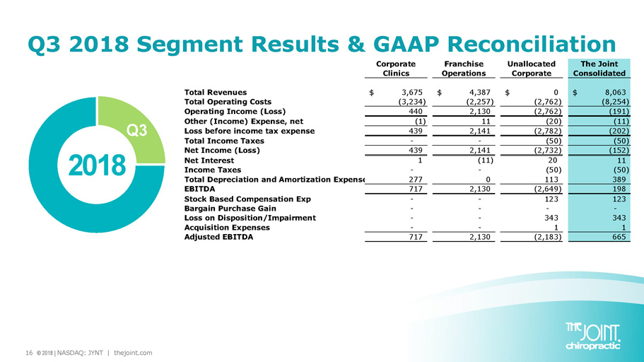 Non - GAAP Measure Definition This presentation includes a presentation of EBITDA and Adjusted EBITDA, which are non - GAAP financial measures. EBITDA and Adjusted EBITDA are presented because they are important measures used by management to assess financial performance, as management believes they provide a more transparent view of the Company’s underlying operating performance and operating trends. Reconciliations of net loss to EBITDA and Adjusted EBITDA are presented where applicable. The Company defines EBITDA as net income (loss) before net interest, taxes, depreciation and amortization expenses. The Company defines Adjusted EBITDA as EBITDA before acquisition - related expenses, bargain purchase gain, loss on disposition or impairment, and stock - based compensation expenses. EBITDA and Adjusted EBITDA do not represent and should not be considered alternatives to net income or cash flows from operations, as determined by accounting principles generally accepted in the United States, or GAAP. While EBITDA and Adjusted EBITDA are frequently used as measures of financial performance and the ability to meet debt service requirements, they are not necessarily comparable to other similarly titled captions of other companies due to potential inconsistencies in the methods of calculation. EBITDA and Adjusted EBITDA should be reviewed in conjunction with the Company’s financial statements filed with the SEC. 15 © 2018 | NASDAQ: JYNT | thejoint.com