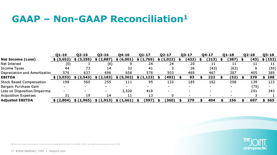 16 © 2018 | NASDAQ: JYNT | thejoint.com Q3 2018 Segment Results & GAAP Reconciliation 2018 Q3 Corporate Clinics Franchise Operations Unallocated Corporate The Joint Consolidated Total Revenues 3,675$ 4,387$ 0$ 8,063$ Total Operating Costs (3,234) (2,257) (2,762) (8,254) Operating Income (Loss) 440 2,130 (2,762) (191) Other (Income) Expense, net (1) 11 (20) (11) Loss before income tax expense 439 2,141 (2,782) (202) Total Income Taxes - - (50) (50) Net Income (Loss) 439 2,141 (2,732) (152) Net Interest 1 (11) 20 11 Income Taxes - - (50) (50) Total Depreciation and Amortization Expense 277 0 113 389 EBITDA 717 2,130 (2,649) 198 Stock Based Compensation Exp - - 123 123 Bargain Purchase Gain - - - - Loss on Disposition/Impairment - - 343 343 Acquisition Expenses - - 1 1 Adjusted EBITDA 717 2,130 (2,183) 665